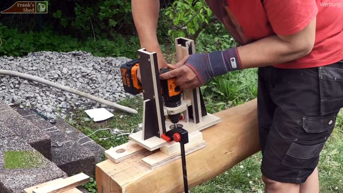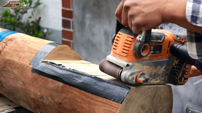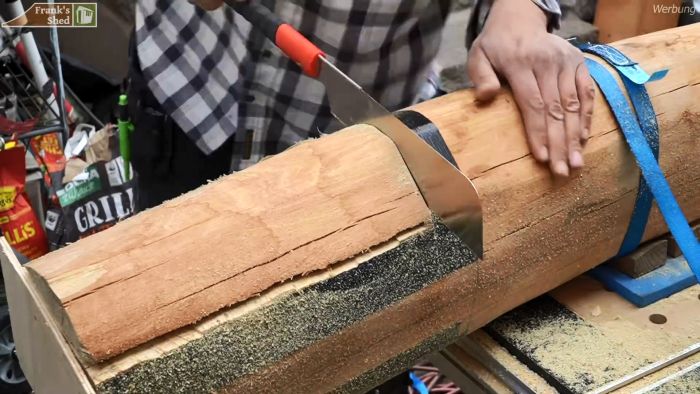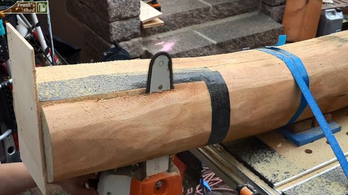Затем снизу столба в продольном направлении, с двух сторон, на длину скобы выпиливается лишняя толщина. Чтобы не резать на перекос, следует прикрутить к кругляку шаблоны из фанеры на торец и бока. Это позволит сделать подрезку ножовкой.