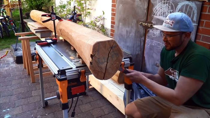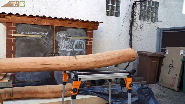 Строительство террасы начинается из установки столбов. Опоры нужно расположить ровно и надежно, чтобы монтировать на них перекрытие. Выбранный для этого кривой кругляк требуется высушить, и снять с него кору.