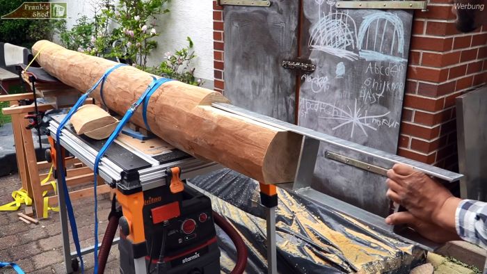 После подготовки нижнего торца, столб нужно укоротить сверху до необходимой длины, и сделать паз для монтажа перекрытия. Важно учитывать, что кругляк кривой, потому длина измеряется натянутой, а не провисающей рулеткой.