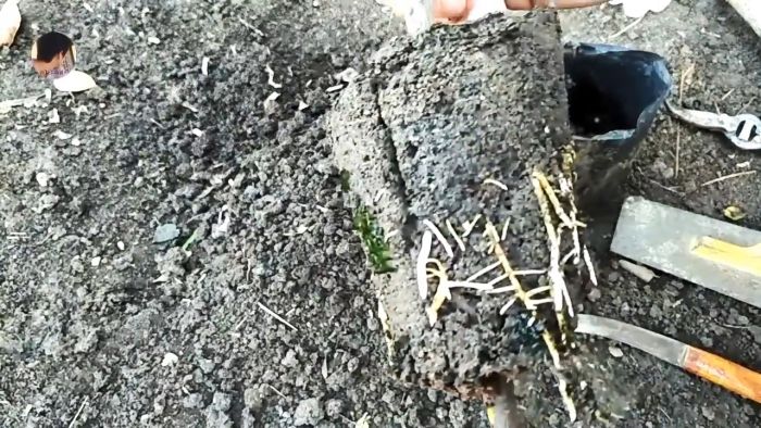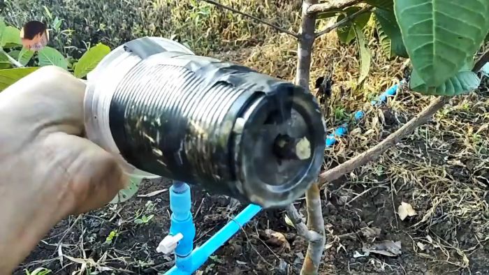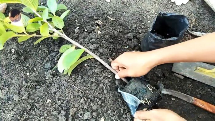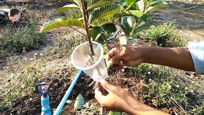 Теперь необходимо скрепить стаканчик изолентой или скотчем, и затем засыпать его обычно землей, взятой под стволом этого же дерева. Она утрамбовывается и заливается водой.