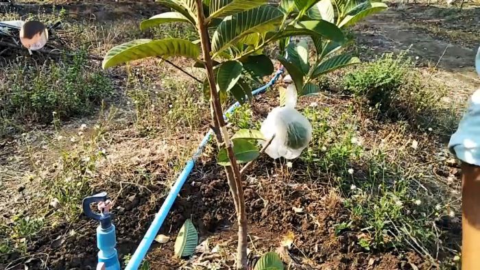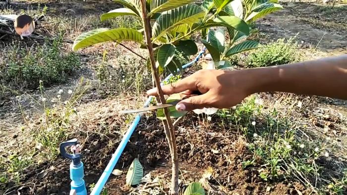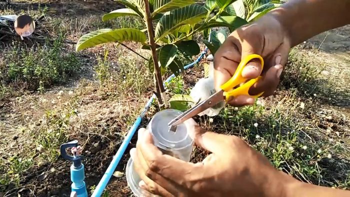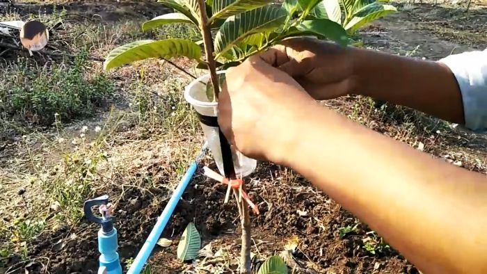 Разрез на стенке требуется продолжить до этого отверстия. Затем подготовленный стаканчик сбоку надевается на ветку, чтобы оголенная часть без коры оказался внутри.