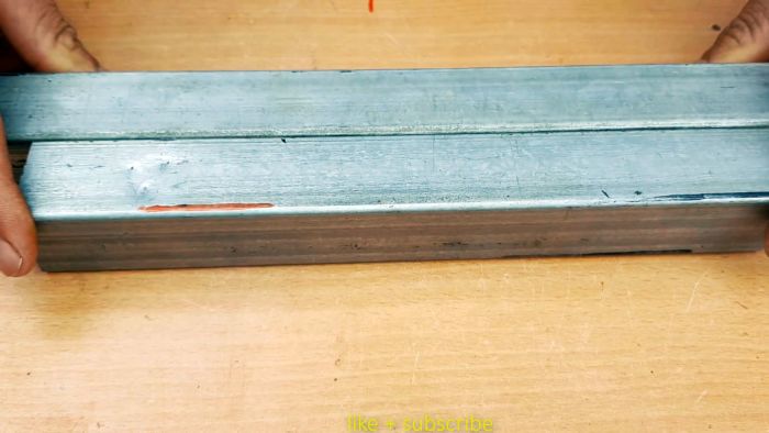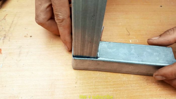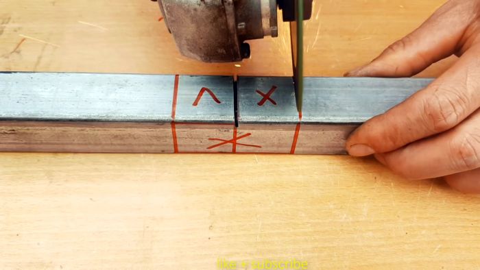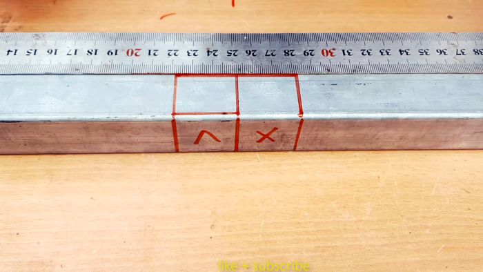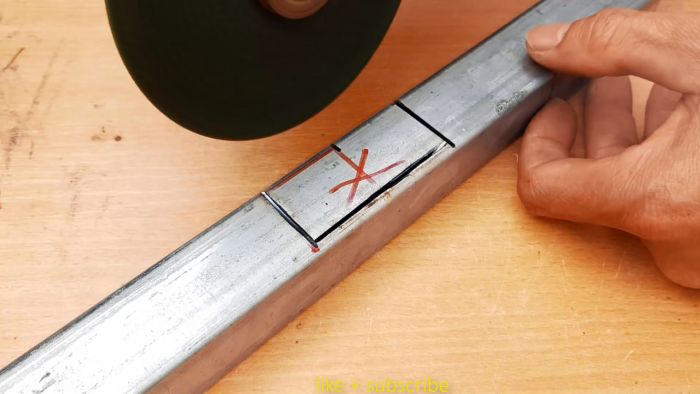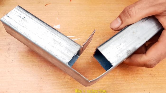 Суть соединения в том, что одна труба квадратного сечения сгибается, создавая прямой угол, а к ней под 90 градусов прикручивается такая же вторая трубка. Вся загвоздка в выполнении правильной подрезки первой заготовки. Для этого нужно определить место выполнения изгиба. По нему с помощью угольника рисуется поперечная линия. Необходимо также начертить с боков от нее по параллели, с отступом на ширину трубы. Такие же 3 линии рисуются на двух соседних сторонах заготовки.