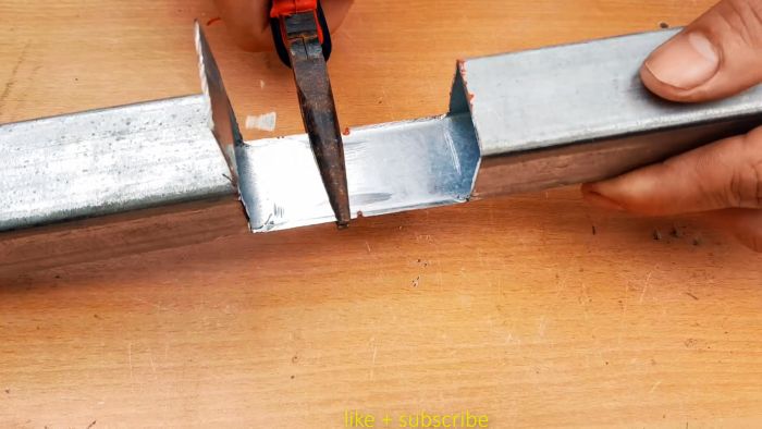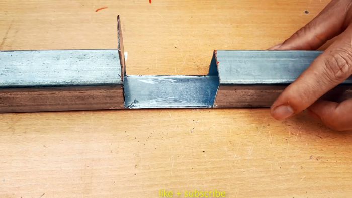 На оставшейся не спиленной стороне трубы требуется сделать насечки с двух сторон ровно по центру. Это нужно, чтобы согнуть ее внутрь под прямым углом.