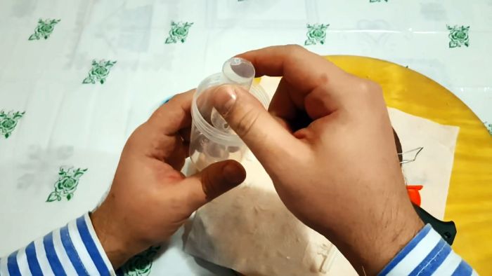 В стенках шприца необходимо высверлить 2 овальных отверстий за 2 мм от спиленного края. Отверстие же от носика заклеивается.