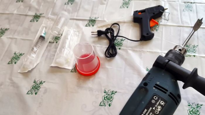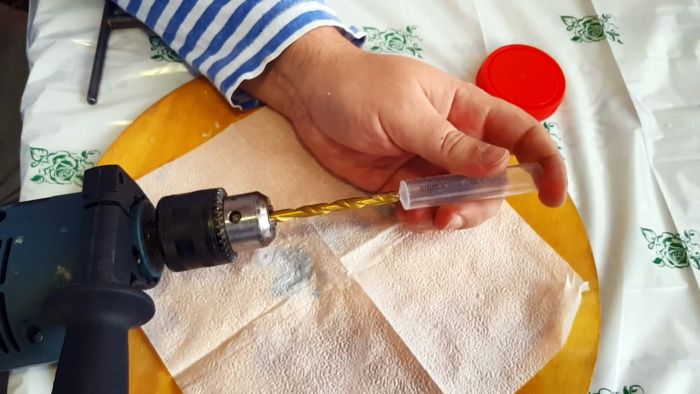 Также нужно рассверлить отверстие от носика шприца 10 куб до 8 мм.