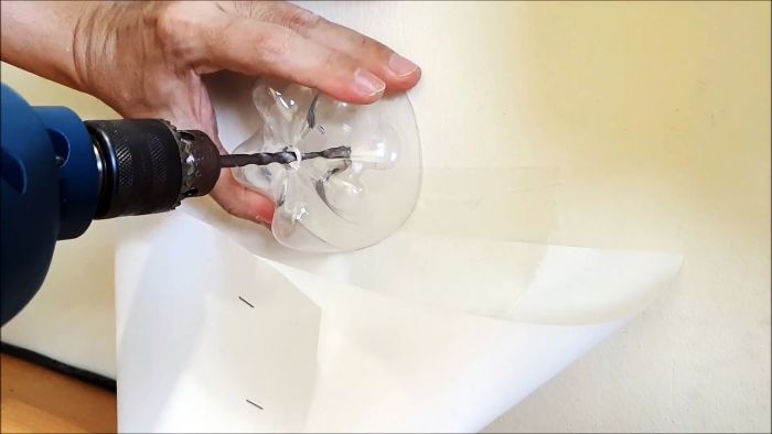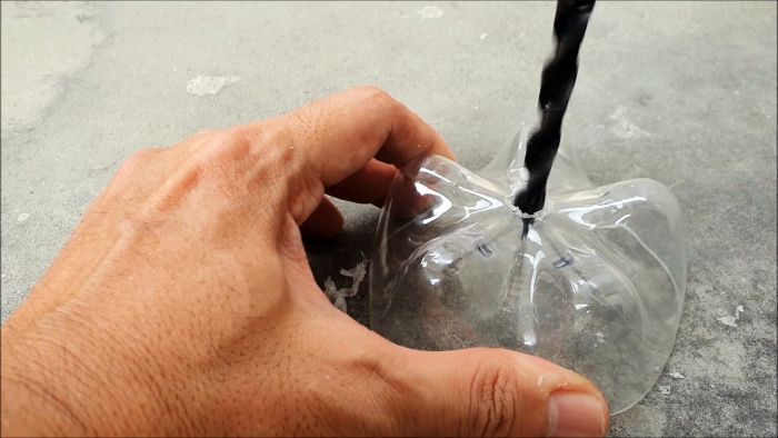 Далее в центре дна бутылки сверлим отверстие. Диаметр которого должен быть больше рабочего сверла в 1,5-2 раза.