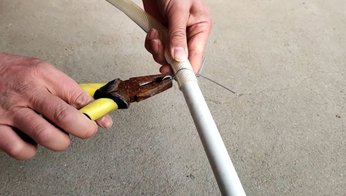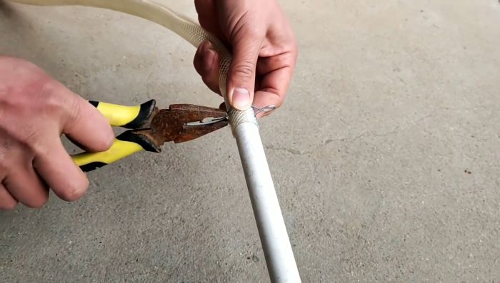 Заготовка прикладывается к шлангу, и ее края скручиваются плоскогубцами. Достаточно 3-4 полных оборота.