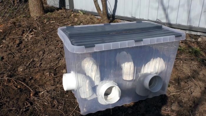 В стенках контейнера нужно просверлить отверстия коронкой по дереву под диаметры уголков. Колена требуется вставить так, чтобы их низ возвышался над дном лотка на 10 мм.