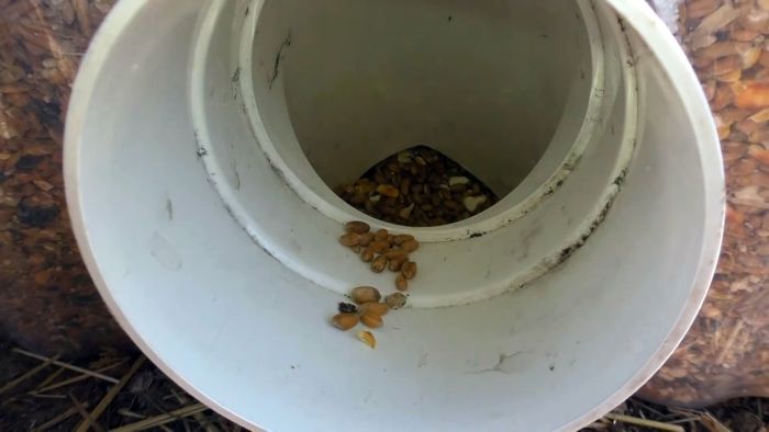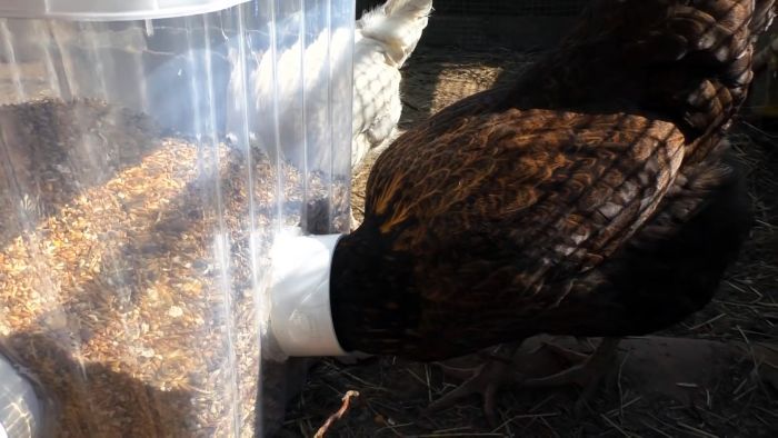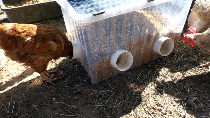 После его высыхания кормушка помещается в курятнике, и заполняется кормами. Куры смогут клевать их, просовывая головы внутрь через уголки.