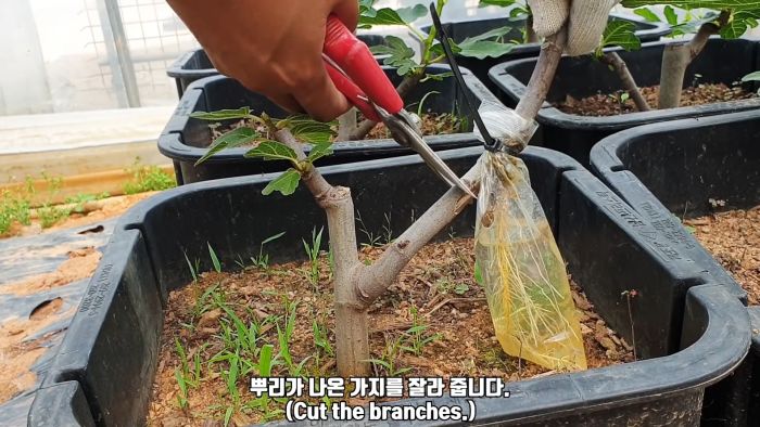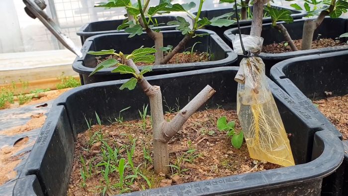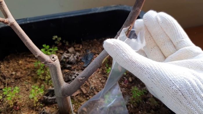 Спустя 1-2 месяца из среза вырастут крепкие корешки. Срок их появления зависит от того, на каком дереве выполняется формирование саженца, а также сезона. Если в процессе вода в пакете уже заканчивается, но достаточно сильной корневой системы еще нет, то ее нужно долить.