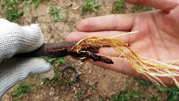 Сформированный саженец отрезается от материнского растения секатором немного ниже корешков.