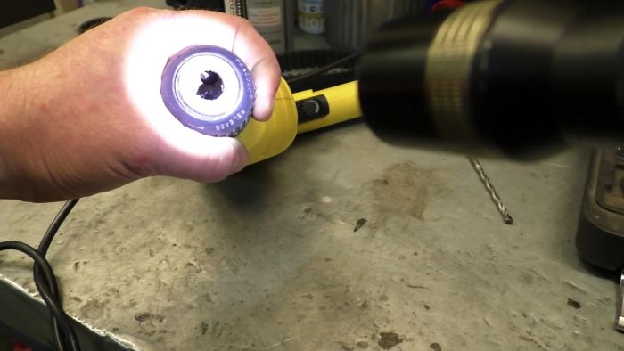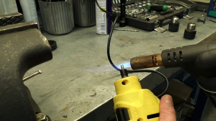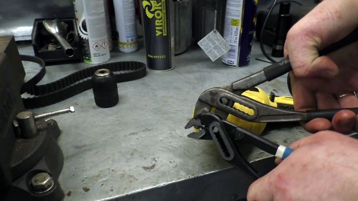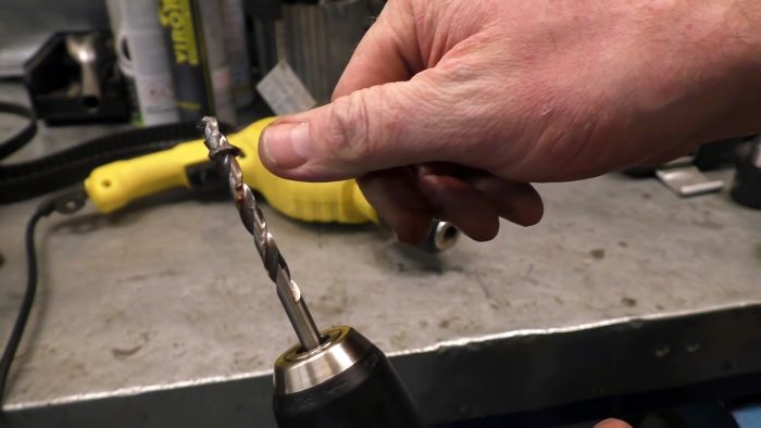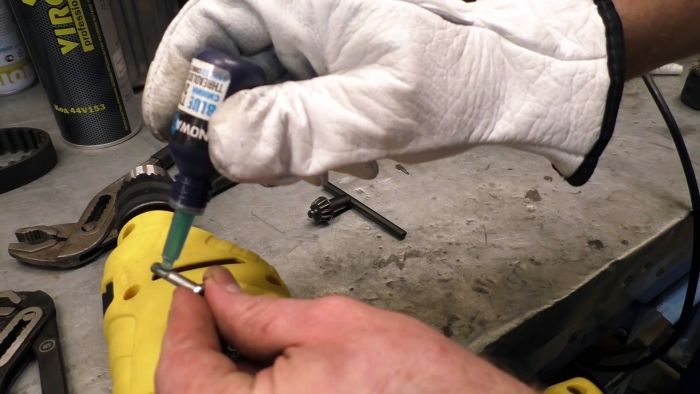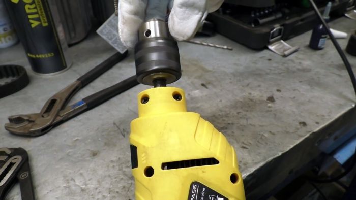 Затем удерживая шпиндель дрели за резьбой, он выкручивается переставными клещами.