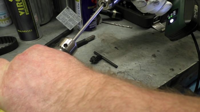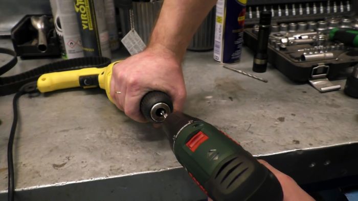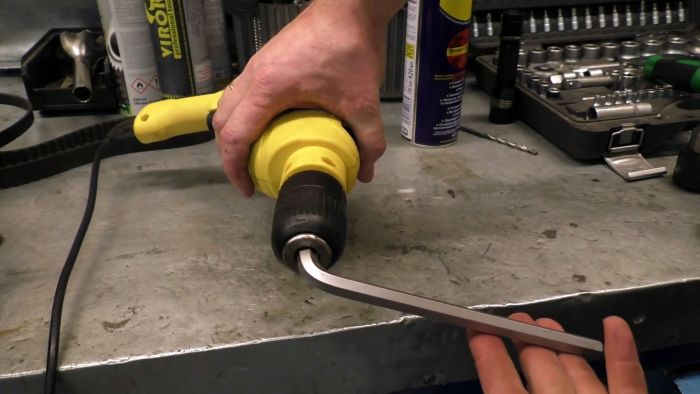 Далее в патрон зажимается шестигранный ключ, и дрель переводится в режим реверса, чтобы вращение происходило по часовой стрелке. Ключ нужно подвести под столешницу верстака, и запустить дрель. В результате короткого удара патрон раскрутиться, не повреждая шестеренчатую пару.