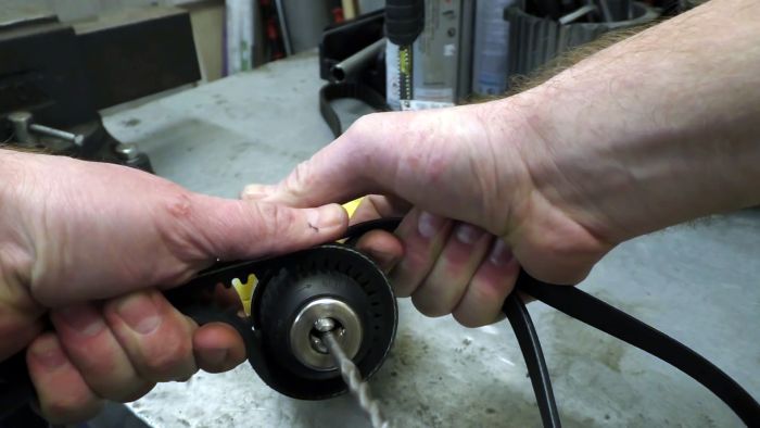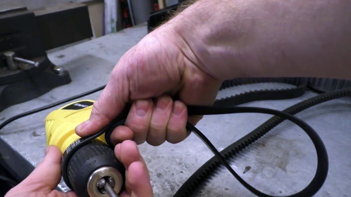 Чтобы разжать патрон, необходимо захватить его половины двумя приводными ремнями. Один выводится влево, второй вправо, и они захватываются руками. Нужно, обжать патрон ремнями, и свести руки вниз, чтобы он провернулся. В результате тот разжимается.