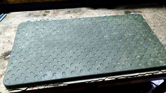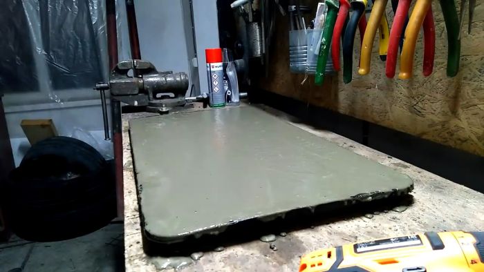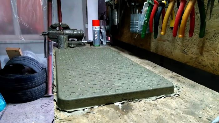 Нужно подобрать пластиковую форму, в которую будет заливаться бетон. Ее высота должна быть как минимум 20 мм (в данном примере использован обувной поддон).