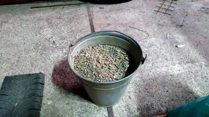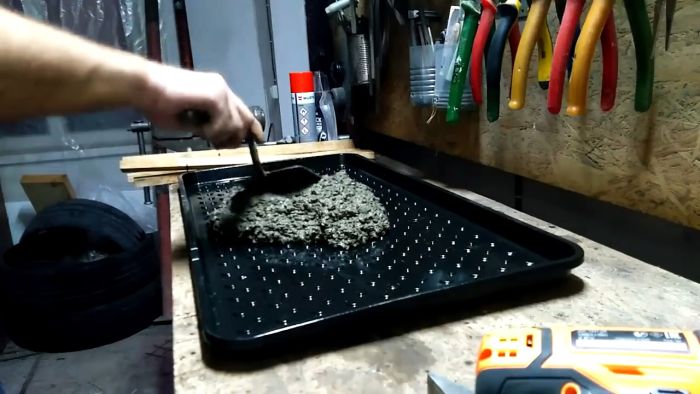 В форму наполовину заливается бетон. Для его приготовления смешивается 2 части отсева и 1 часть цемента. Воды нужно вливать минимум, чтобы добиться большей прочности раствора.