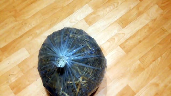 Часть соломы нужно наложить на дно прозрачного полиэтиленового мешка. На нее под стенки укладываются несъедобные ножки грибов.