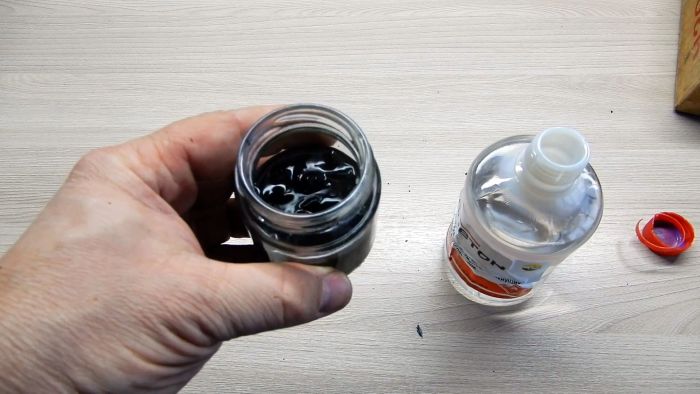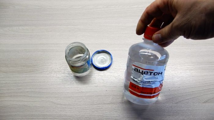 Измельченный лом набирается в стеклянную баночку с крышкой, и заливается небольшим количеством ацетона. Примерно за 12-24 часа, в зависимости от размера кусков, пластик полностью растворится. Нужно просто иногда его открывать и помешивать.