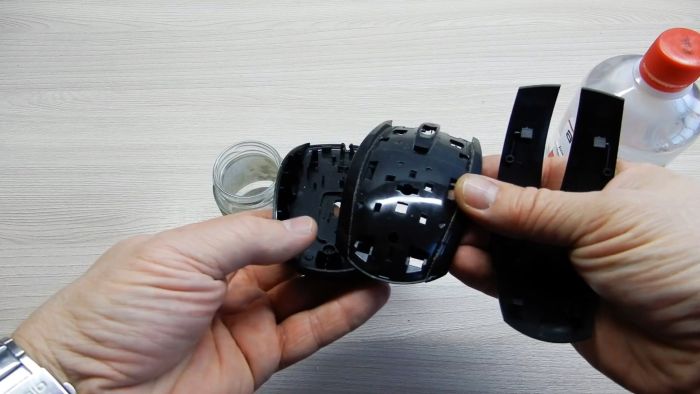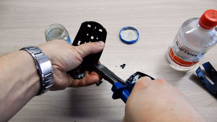Для приготовления клея нужно нарезать лом ABS пластика на мелкие кусочки. Определить что изделие сделано именно из акрилонитрилбутадиенстирола можно по соответствующей надписи в маркировке. Обычно из этого пластика делают корпуса бытовой и оргтехники. От цвета используемого лома зависит и оттенок готового клея. Если, к примеру, нужен черный состав, то применять нужно темный пластик.
