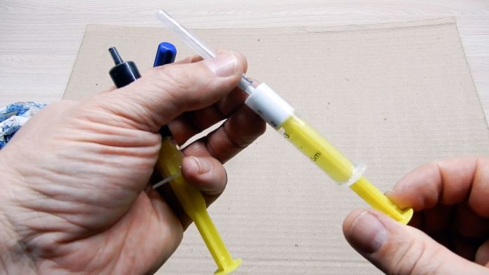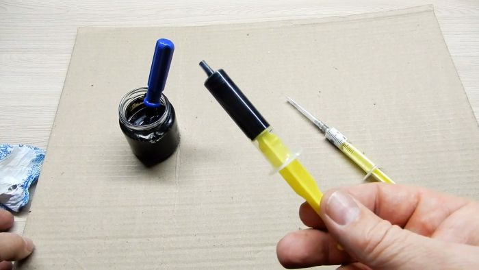 Если состав получился сильно жидким, то можно подержать его с открытой крышкой для выветривания излишков растворителя. В таком виде клей уже может использоваться для склейки изделий из ABS. Очень удобно это делать, набирая его в шприц.