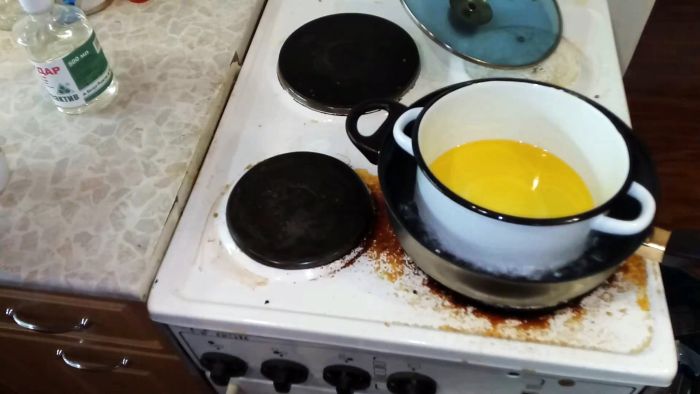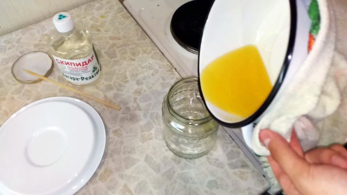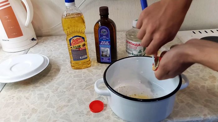 Когда воск расплавится уже в масле, вливается скипидар и смешивается.