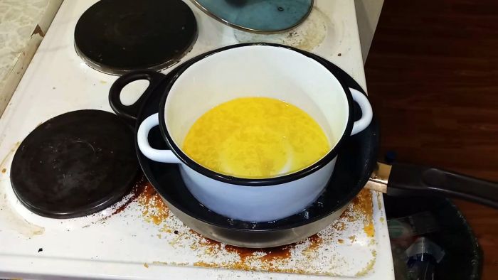 Компоненты засыпаются в емкость и расплавляются на водяной бане.