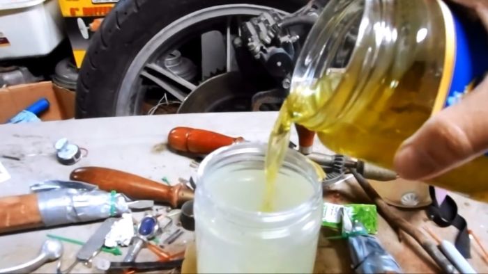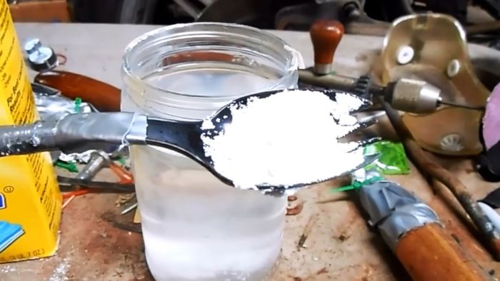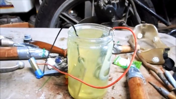 Для работы нужно приготовить электролит. В обычную теплую водопроводную воду добавляется кальцинированная сода, для урегулирования pH, в расчете 1 ложка на 0,5 л.