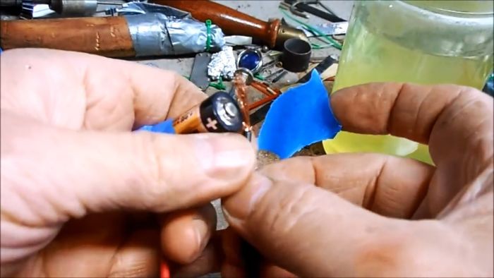 После этого требуется подключить цинковый анод проводом к плюсовому контакту пальчиковой батарейки, а само изделие для оцинковки к минусу.