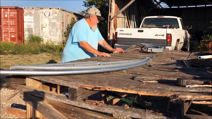 Определившись с радиусом изгиба и длиной окружности верхней части арки, нужно подготовить для каждой из них 2 трубы. С одного их края требуется поставить метки за 15-20 см. До них трубы должны остаться ровными без изгиба, чтобы стыковаться со столбами.