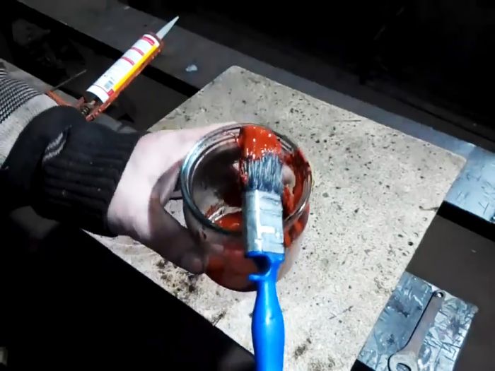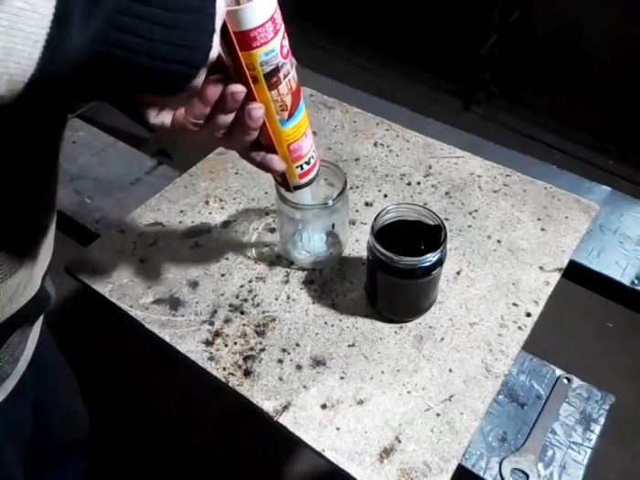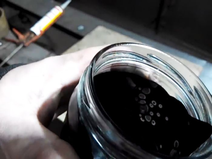 Затем в отдельную емкость набирается герметик и растворяется в бензине. На 1 л битума добавляется четверть тубы силикона. Бензина является растворителем.