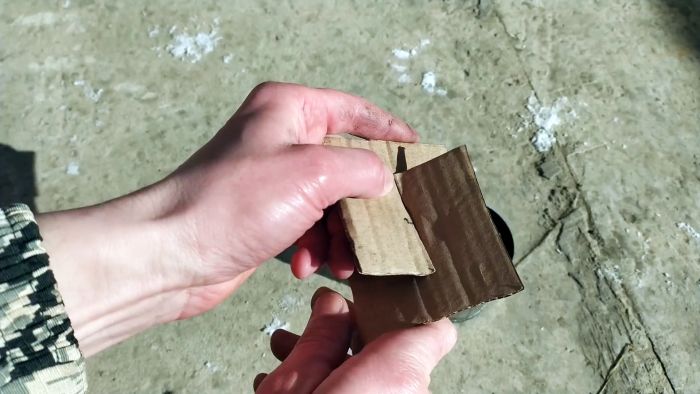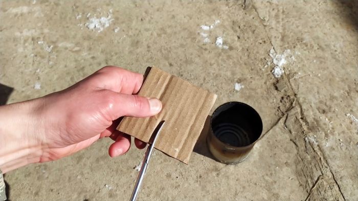 Чем она вместительней, тем дольше будет горение без дозаправки. В банку вырезается фитиль из гофрокартона. Для этого 2 картонных прямоугольника нужно разрезать вдоль наполовину.