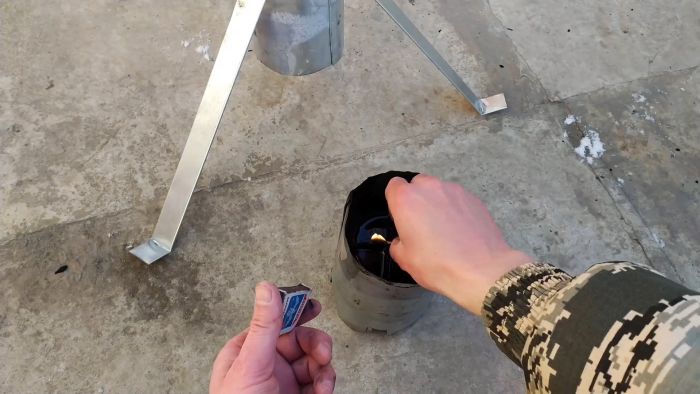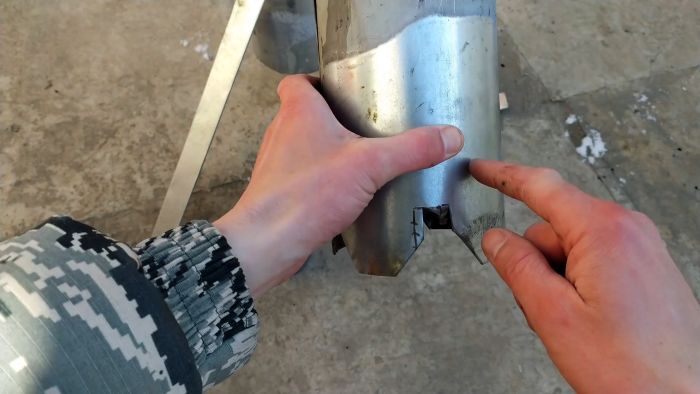 Верхняя ступень печки представляет собой более длинный кусок водосточной трубы, который надевается раструбом на низ. Вверху вторая ступень стыкуется с тонкой трубкой дымоходом. Последнюю нужно будет вывести за пределы палатки или теплицы. Для устойчивости ко второй ступени на заклепки устанавливаются 3 ножки из полосы жести.