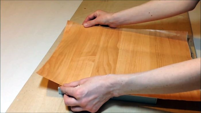 После высыхания клея на полку приклеивается мебельная пленка, подобранная под цвет шкафчика. У нее понемногу срывается подложка, и она равномерно приглаживается без пропусков, чтобы избежать образования пузырьков воздуха.