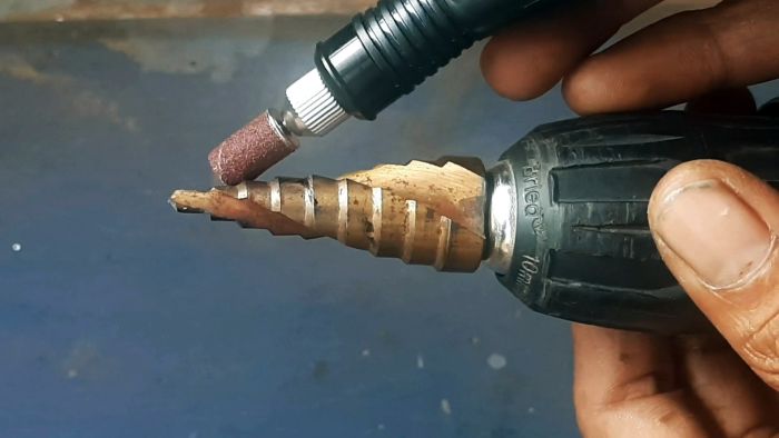 Также обновить ступени сверла можно бормашиной с шлифовальной насадкой. Инструмент приставляется сверху под тем же углом, что выполнен скос ступени. Этот метод более быстрый, чем напильник. Нужно сразу протачивать края ступенек, а потом подгонять под них середину.