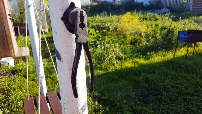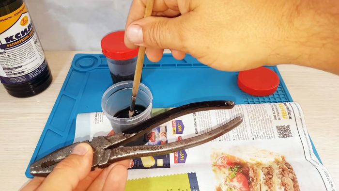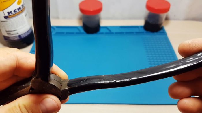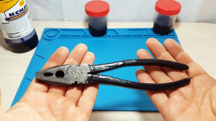 Самодельный пластик отлично пристает к металлу, поэтому им можно покрыть ручки любого металлического инструмента. Просто берем кисточку и как краску густым слоем наносим состав на, скажем, плоскогубцы.