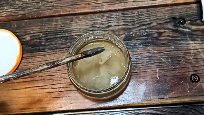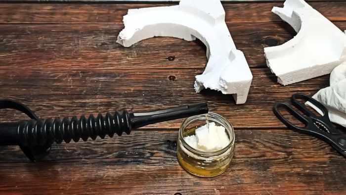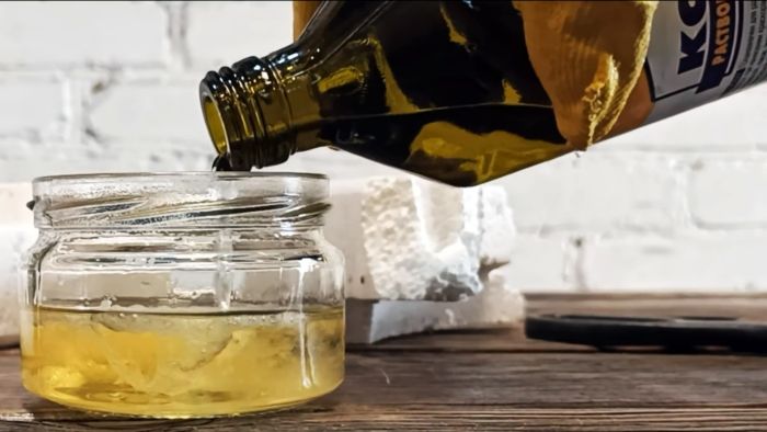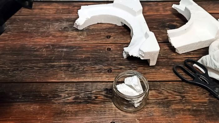 Для изготовления ремонтного клея нужно набрать в стеклянную емкость небольшое количество бензина, и растворить в нем куски пенопласта.