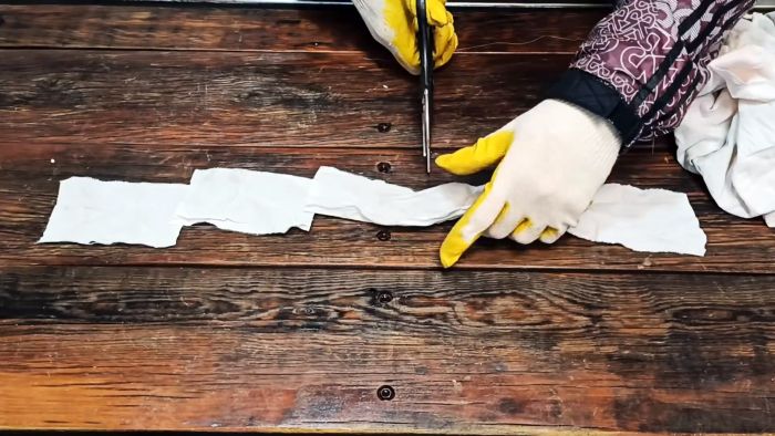 После приготовления клея, нужно сделать армирующие заплатки из ветоши. Ткань нарезается кусками подходящего размера.