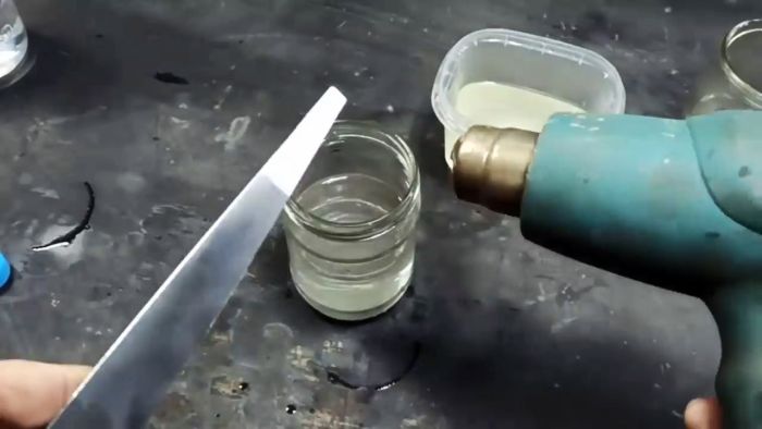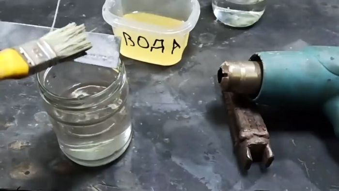 Теперь деталь в обработанном месте нужно разогреть до 400-500°С. Это делается монтажным феном или горелкой. Определить степень нагрева можно по цветам побежалости. Нужно греть металл до серого оттенка. Как только он начнет переходить в красновато-коричневый, требуется погрузить деталь в раствор цинка. После этого остатки кислоты смываются водой с содой.