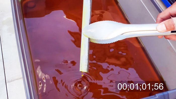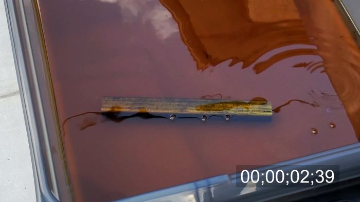 Растворение коррозии займет всего несколько минут, даже на очень ржавых поверхностях. Периодически деталь нужно переворачивать, так как уложенная на дно сторона протравливается хуже. Держать изделие дольше пары минут не стоит, так как кислота начнет растворять уже чистый металл. К детали можно прикасаться только щипцами или плоскогубцами. По мере растворения ржавчины кислота начнет становиться коричневой.