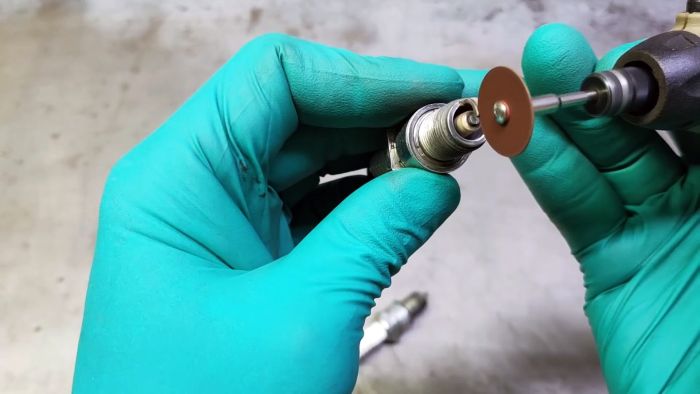 Необходимо отогнуть боковой электрод свечи, и сделать на нем продольный разрез бормашиной. Нужно стараться делать пропил ровно по центру. Получится некое подобие более продвинутых современных свечей с двумя или тремя боковыми электродами.