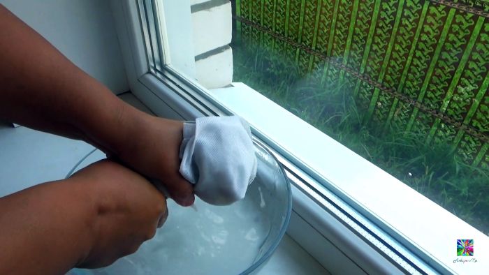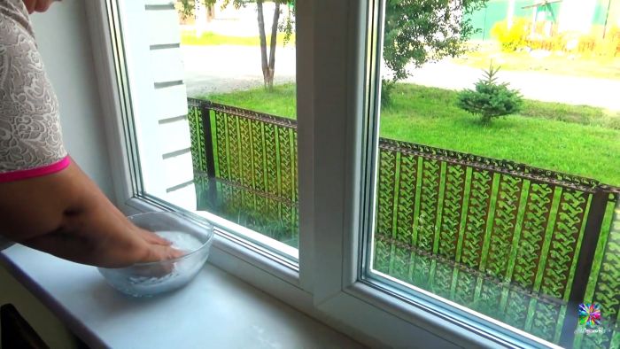 Нужно вымыть и вытереть окна от разводов. Далее заблаговременно вырезанные по размеру стекол куски тюля окунаются в теплый водный раствор крахмала. Тот должен быть как кисель, не гуще.