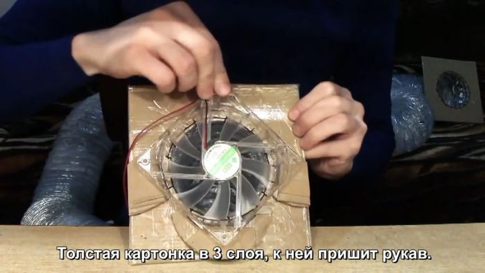 К гофротрубе по краям пришиваются накладки из картона с отверстиями. Лучше всего склеивать их из пары слоев картона, чтобы они были жесткими. Затем на один конец рукава устанавливается вентилятор.