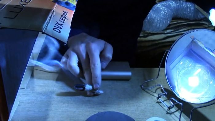Из картонного ящика делается купол вытяжки и присоединяется ко второму краю гофротрубы. Теперь при включении вентилятора воздух с испарениями и дымом будет засасываться внутрь, и отводится из рабочей зоны наружу.