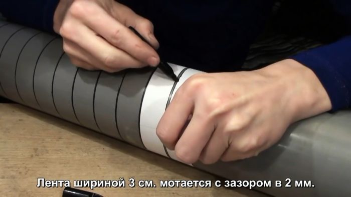 Далее расчерчивается шаблон для гофротрубы. Для этого идеально подходит канализационная труба 110 мм. На нее наматывается бумажная лента шириной 3 см. Между ее витками делается зазор 2 мм, и она обводится маркером.