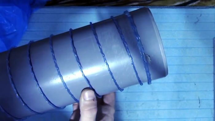Трубка из бутылки наматывается на канализационную трубу. С одного края ее следует прихватить клеем. Дальше она обливается кипятком, чтобы трубка приняла форму.