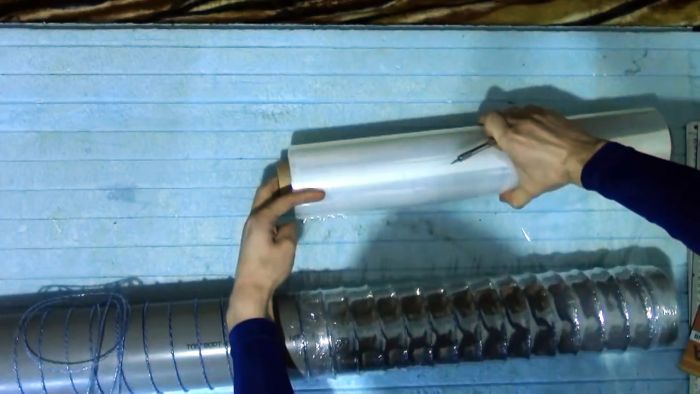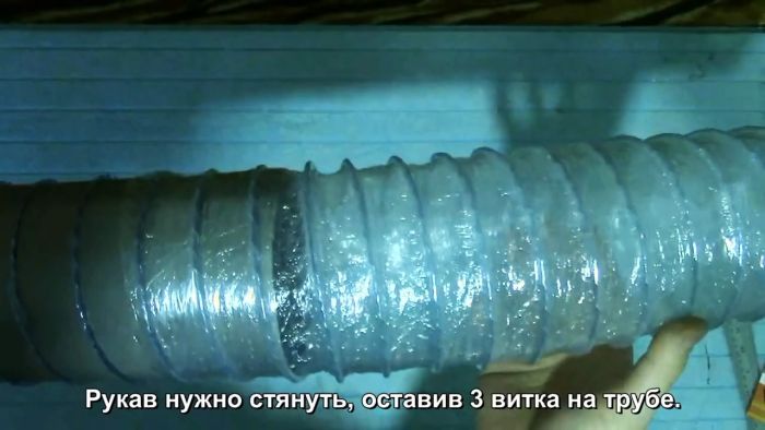 Трубка послужит каркасом для гофры. Дальше нужно намотать на канализационную трубу стрейч-пленку. Первый виток делается без натяжения, затем 3 с растяжением пленки на 5-10%. Обматывать следует ровно. Затем умотанная часть стягивается, на трубе оставляется 3 витка и все повторяется заново с нахлестом на них. Так можно сделать гофру любой длины, хоть 10 м.