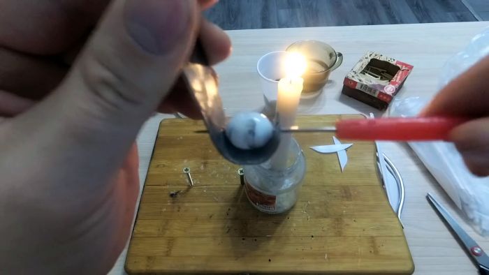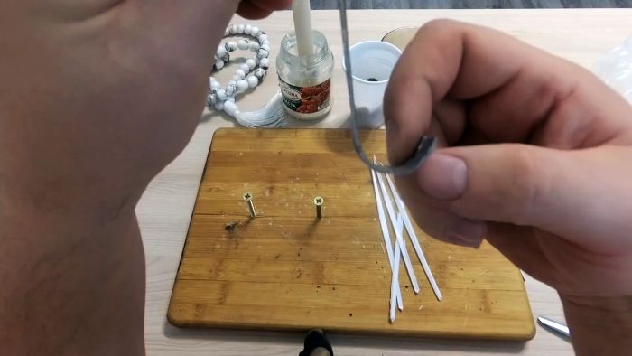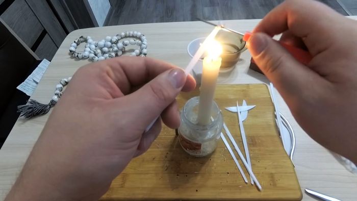 Далее разжигается свечка, над ней разогревается край полосы пластика и наматывается на шило.