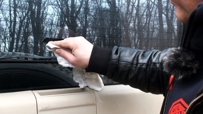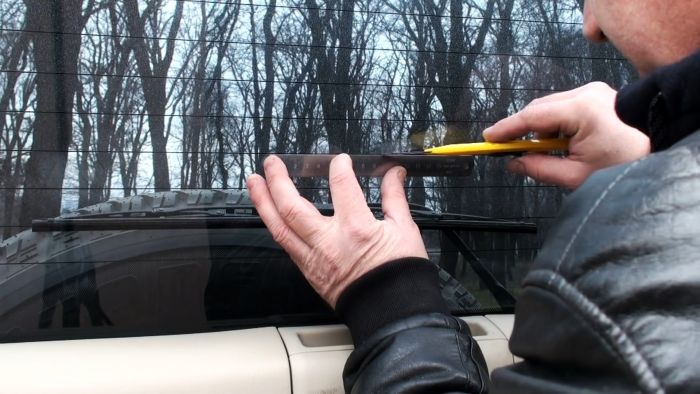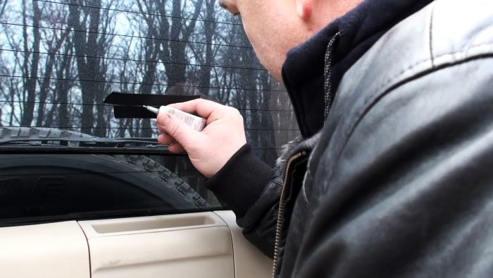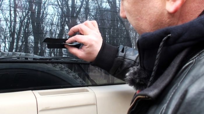 Если стекло тонировано пленкой, тогда очередность действий немного меняется. Первым делом нужно приложить вдоль нити линейку и прорезать по ней пленку сверху и снизу греющей полосы.