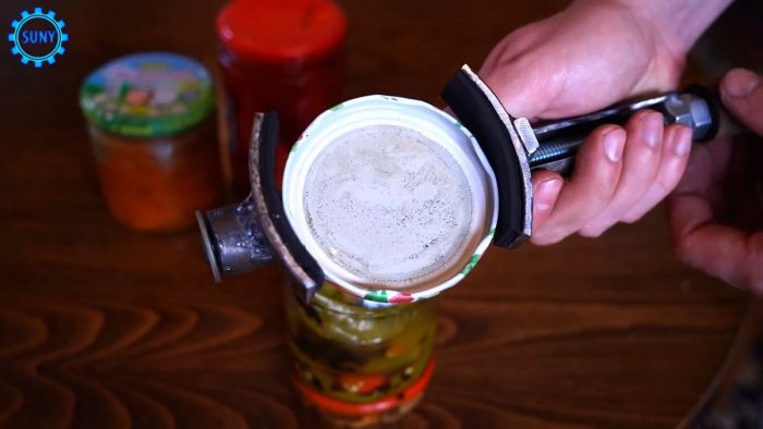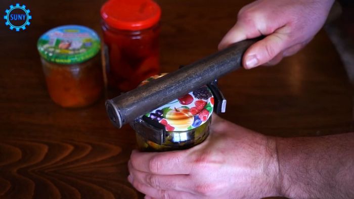Затем инструмент зажимается на ней, и поворачивается против часовой стрелки. Банку при этом нужно придерживать. Благодаря длинному рычагу крышка откроется без усилий.