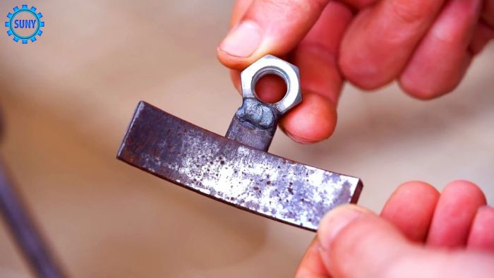 К грани гайки М12 приваривается флажок из полосы. По ширине он должен свободно скользить внутри прорези трубы. Его длина делается 30 мм. Далее из полосы выгибается 2 губки для захвата крышки банки. Одна из них приваривается к флажку на гайке.